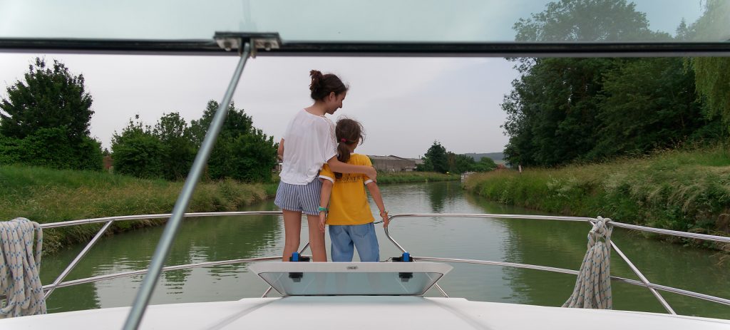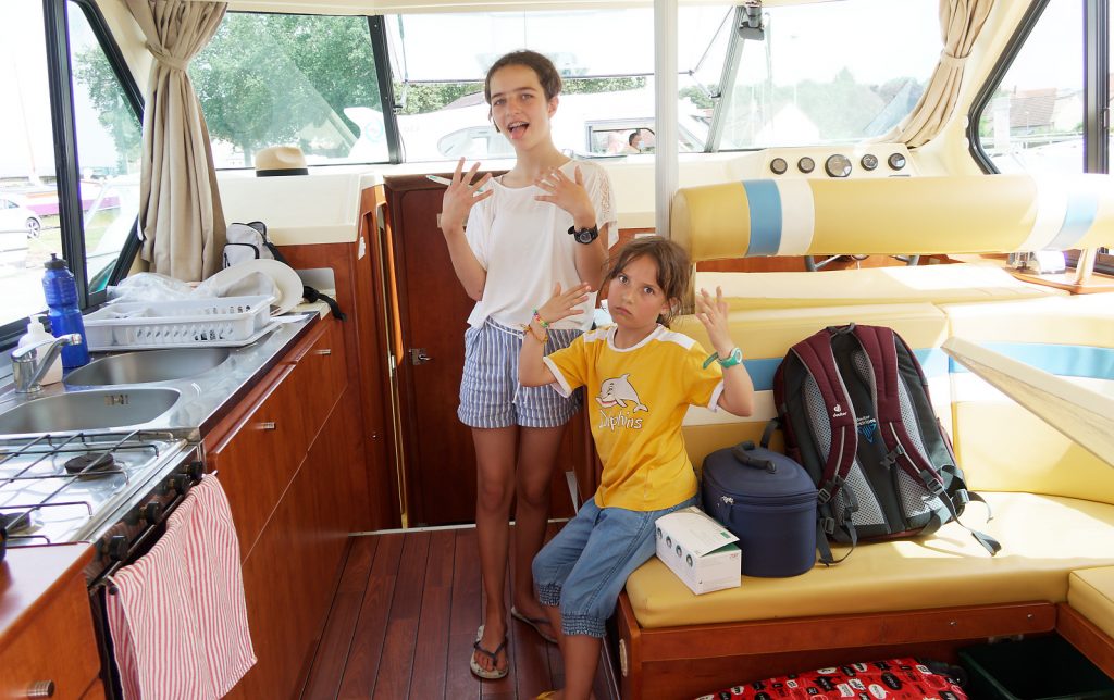 La Bourgogne nous a accueilli à bras ouverts, avec ses douces collines verdoyantes, ses villages préservés sans traces de progrès et ses vaches blanches (qui, de loin, ressemblent à des moutons). Nous avons fait la connaissance rapprochée avec notre bateau et nous l’avons tout de suite trouvé très beau. Il avait fière allure sous le soleil, avec ses tons brun-ocre à l’intérieur et son blanc-turquoise à l’extérieur. Mais malheureusement le soleil avait eu le temps de le chauffer à point et notre installation s’est vite transformée en sauna gratuit pour toute la famille.
