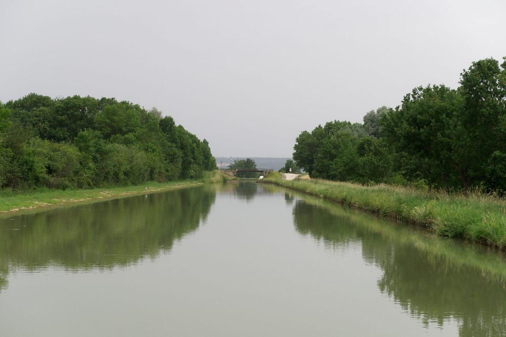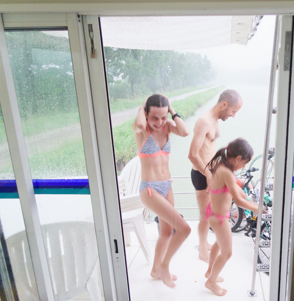 Nous sommes en mode concentration maximale pour le passage de notre première écluse. L’éclusier est averti et nous attend. Mais en nous approchant, pas d’éclusier à l’horizon. Nora saute du bateau avec une agilité remarquable, suivie de sa mère, tout aussi agile. On court à la maison de l’éclusier. On aperçoit un monsieur qui chille dans sa voiture: c’est bien l’éclusier, très surpris de nous voir car il n’a pas été averti. Il commence à remplir l’écluse, puis nous demande on veut aller: à Monbart. Mais c’est de l’autre côté! Demi-tour: nous n’avons donc toujours pas passé d’écluse! Il est 18h30 et ça ferme à 18h45. Finalement nous passons notre première écluse sans problèmes et goûtons enfin aux joies de la navigation sur ce canal si tranquille dans le soir. Nous amarrons en sauvage (pas dans une marine) et pour cela le capitaine plante 2 piquets sur la berge. Il n’y a plus que les grenouilles, les hérons et nous. Mais à ce moment les éléments se déchainent et l’orage éclate. L’occasion de faire une douche naturelle de style tropical!