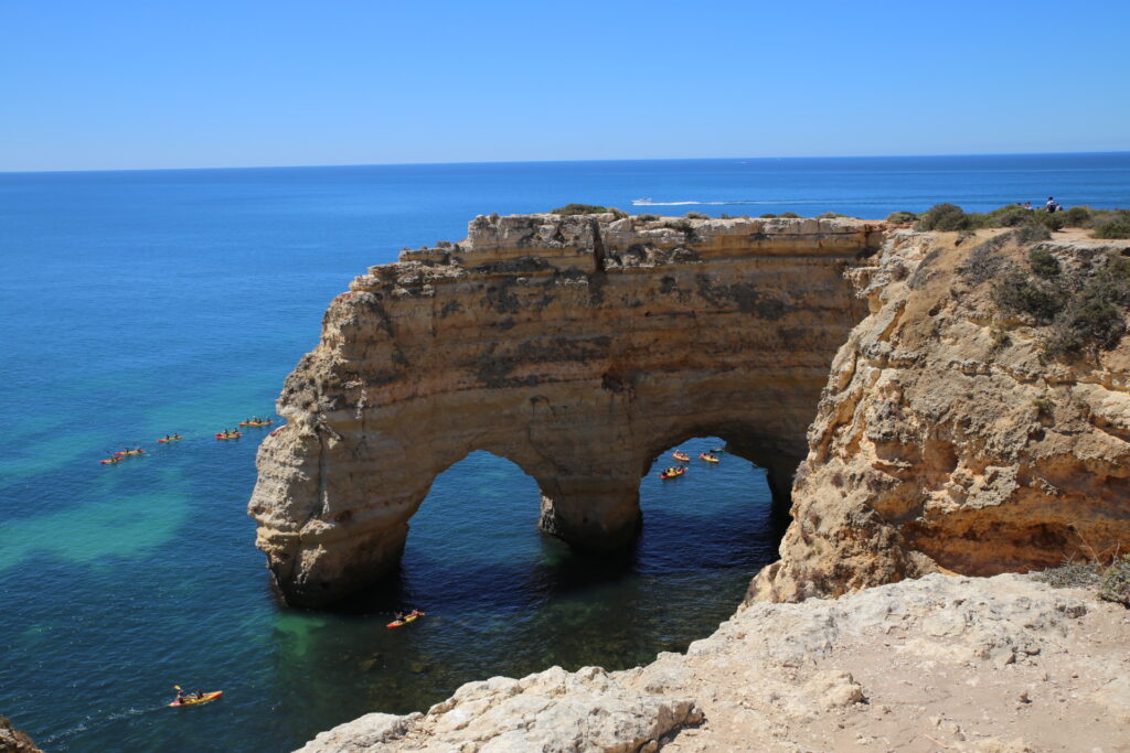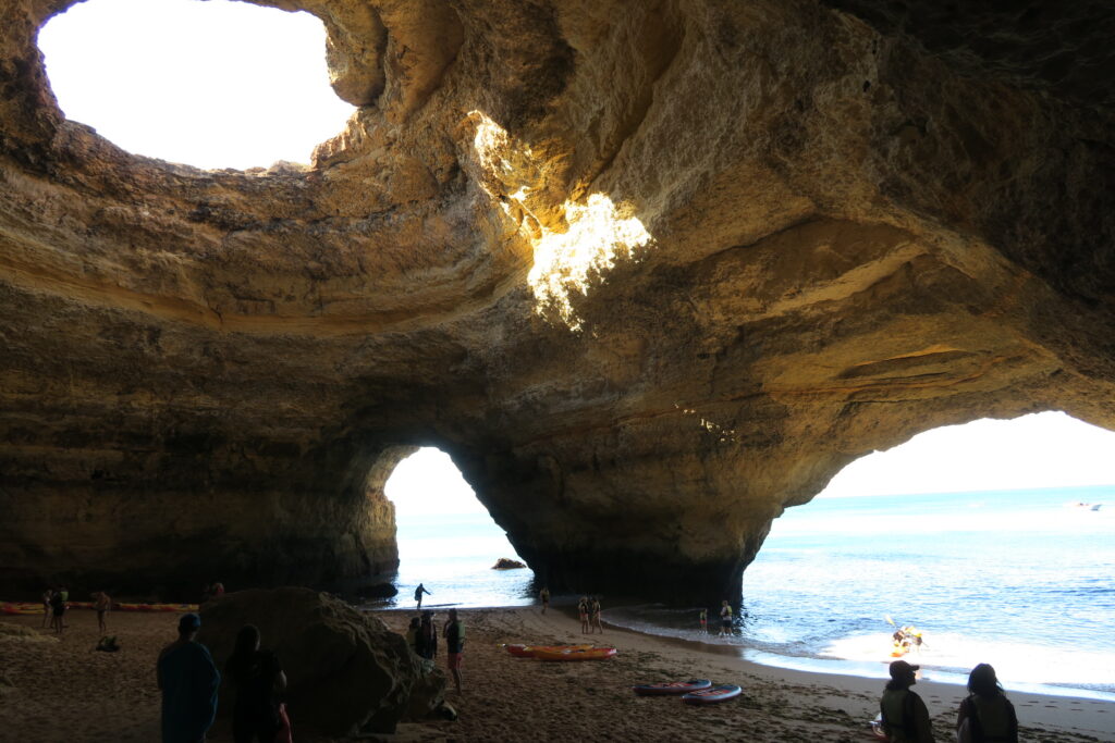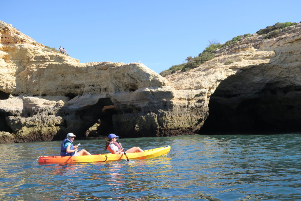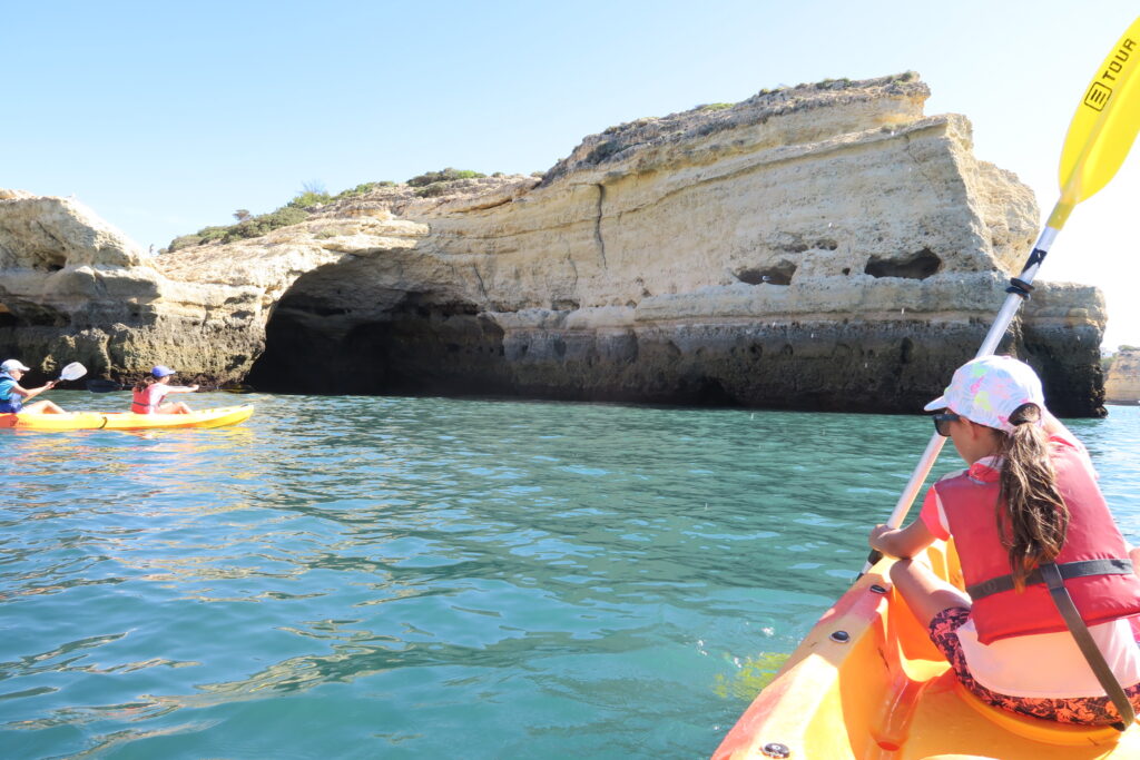 Jeudi, on a dû se lever tôt car on a été faire du kayak. On a été à la belle plage de Benagil dont vous a parlé maman. On a loué deux kayak : un pour papa et Nora et un pour maman et moi. Nous sommes partis pour aller voir la fameuse grotte avec le trou au plafond dont tout le monde parle. Effectivement, elle était très belle même si, débutants que nous sommes, on est entrés par le mauvais coté. Résultat : notre kayak s est retourné et nous avec. Heureusement plus de peur que de mal et on a bien apprécié.