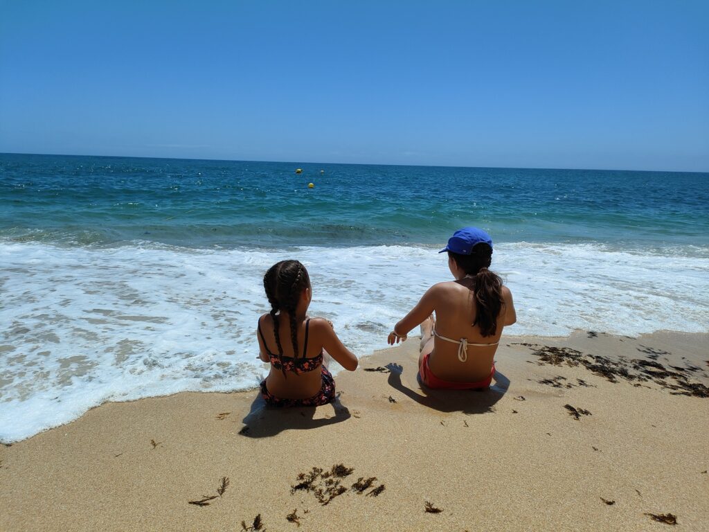 Puis, arrivés en bas, l’eau ne s’étant toujours pas réchauffée, nous avons joué un long moment dans les vagues. Comme des gamins ! Avec Nora, nous nous sommes assises sur le sable pour être mouillées en attendant à chaque fois la prochaine vague, en espérant qu’elle soit encore plus grosse et amusante que la dernière.